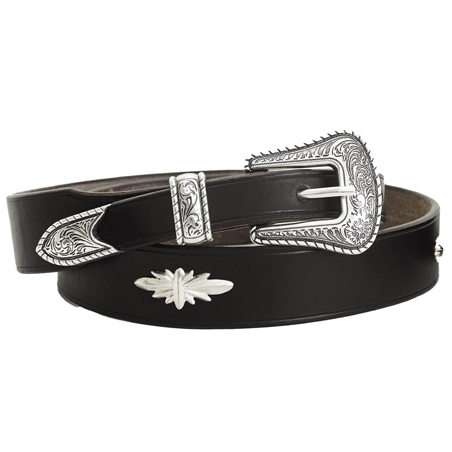 The silver decorations on each belt are 925 sterling. And the 3-piece western belt buckle set is silver-plated(.9999) with a luxurious and substantial feel.